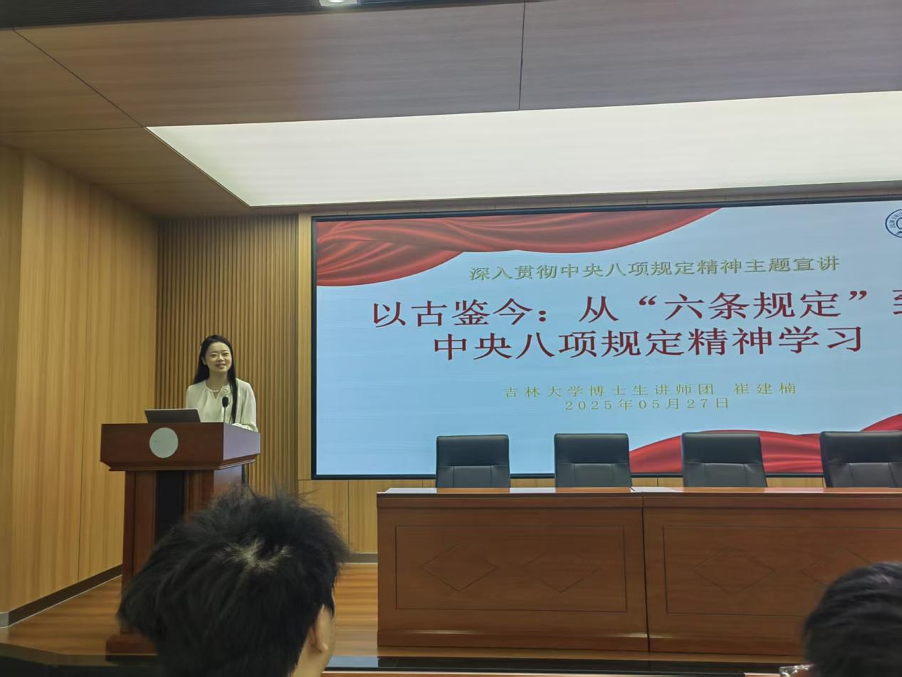 崔建楠以《以古鉴今:从“六条规定”到中央八项规定精神学习》为题,从3个方面进行了深入宣讲。首先,她介绍了八项规定的核心内容与精神实质。接着,她以时间为轴,系统梳理了八项规定的历史轨迹,展现了政策不断完善、落实走实走深的全过程。最后,她强调了高校青年学习中央八项规定精神的重要意义,指出通过政治引领、学风建设、作风养成与时代使命的有机统一,高校青年将在实践中传承优良作风,为推进中国式现代化贡献青春力量。
